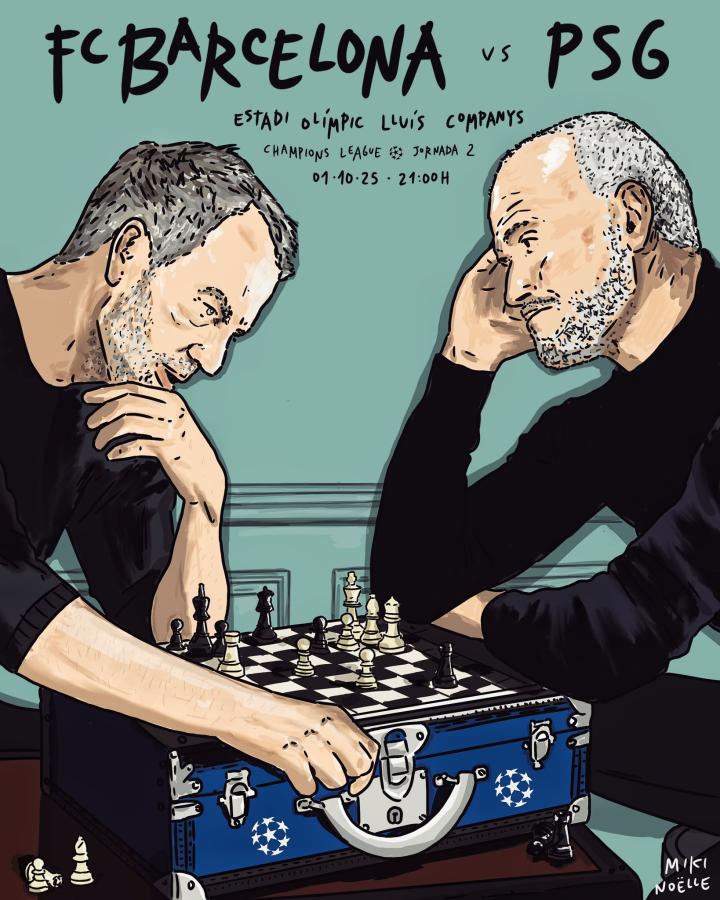 插画艺术家Miki Noëlle精心绘制的巴萨对战巴黎赛前预热海报。